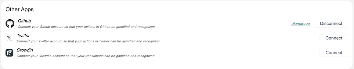 Your GitHub username is now displayed in User Settings > Other Apps, and you can Disconnect to start over and connect to another account.